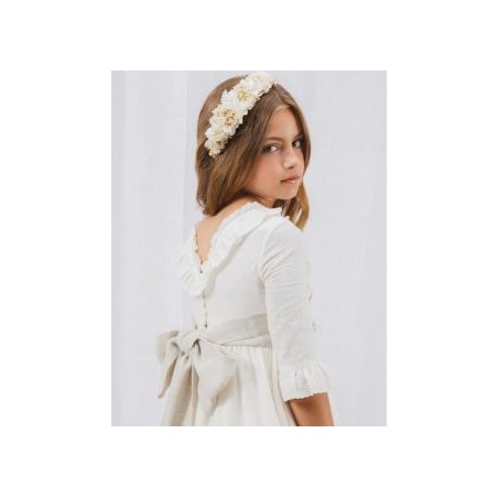 El vestido de Comunión Toscana en tejido rústico, rematado con puntilla bordada en cuerpo, mangas y bajo. Lazada de color piedra. Totalmente forrado.