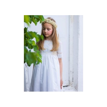 El vestido de Primera Comunión Capri  está confeccionado en lino blanco natural. El pecho está formado por encajes de algodón y terciopelo color ámbar que combinan con el fajín cosido a los costados.  Un vestido elegante y romántico.