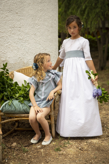 Vestido de Primera Comunión modelo Alejandra, en plumeti bordado y crepe de seda blanco.