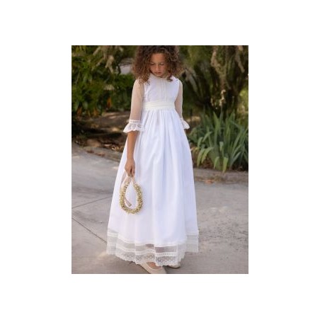 El vestido de Primera Comunión Santorini, en tul de seda de plumeti blanco natural. Un vestido muy fino y elegante.