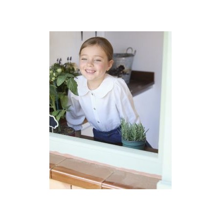 - Blusa blanca para niña con el cuello en forma de flor. - Esta blusa para niña va completamente abotonado por delante. - Hecha en España.